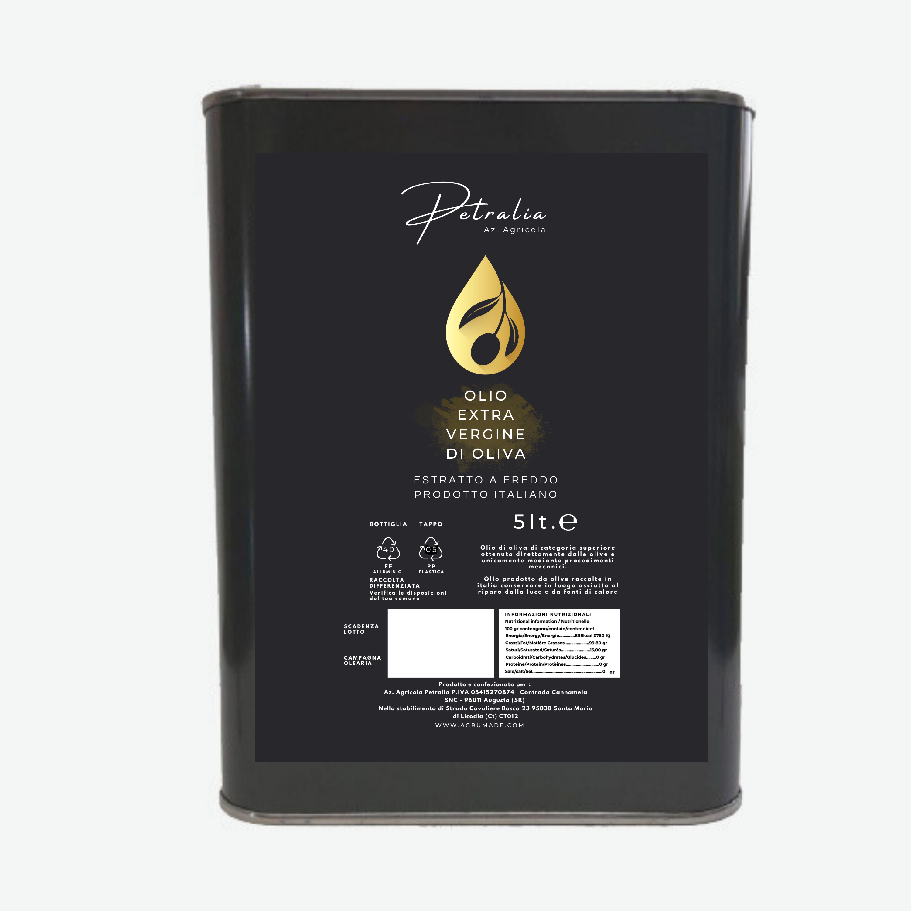 Olio extravergine di oliva Siciliano disponibile in latta da 5 litri.